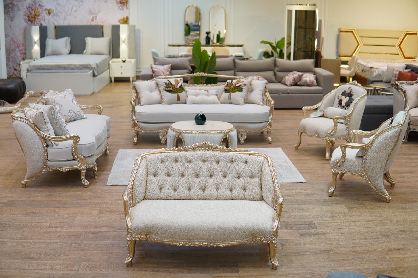 كنبة ثلاثية و كنبة ثنائية و 2 فوتيه و ترابيزة و بانكيت